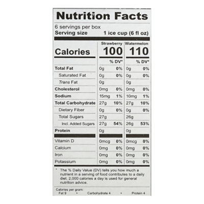 Lindy's Combo Italian Ice | 36 Oz. - 6-Pack | Frozen Novelties Iron. 0.00mg. 0%. Potassium. 0.00mg. 0%. *The % Daily Value (DV) tells you how much a nutrient in a serving of food contributes to a daily diet. 2,000 calories a day is used for general nutrition advice. Ingredients: Strawberry Ingredients: Water, High Fructose Corn Syrup, Corn Syrup. Sugar, Strawberry Puree With Natural Flavors (Contains Fd&C ...